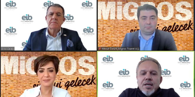In a webinar organized by the Aegean Exporters’ Associations (EİB), Birol Celep, Chairman of the Aegean Dried Fruit and Products Exporters’ Association, Cengiz Balık, Vice Chairman of the Aegean Fresh Fruit and Vegetable Exporters’ Association, Serpil Ürek, Group Manager of Migros Ticaret A.Ş. Product Safety and Environmental Management and Mesut Öztürk, Quality Manager of Migros Ticaret A.Ş. Good Agricultural Practices, talked about food safety and sustainability criteria in the retail sector, good agricultural practices and what should be done for sustainability in agriculture.