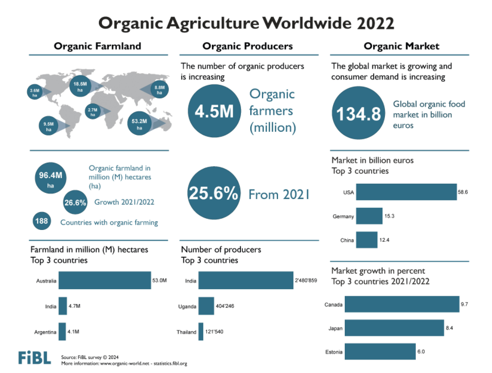 The global organic farming area increased by over 20 million hectares in 2022, reaching 96 million hectares. The number of organic producers also saw a significant rise, surpassing 4.5 million. The sales of organic food reached nearly 135 billion euros in 2022. The latest figures and the statistical yearbook “The World of Organic Agriculture”, which is being published for the 25th time this year, will be presented on Tuesday, February 13, 2024, from 3.45 to 4.45 pm (CET) at BIOFACH, the world’s leading trade fair for organic food in Nuremberg.